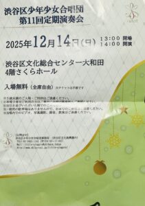 2025年11月17日 / 最終更新日時 : 2025年11月17日 SawadaAkiko コンサート コンサートのお知らせ 12月14日(日) コンサートのお知らせです。 渋谷区少年少女合唱団 第11回定期演奏会 入場無料です。 お時間ある方 ぜひ足を運んでください。 若さ溢れる素敵な歌声を堪能してください。